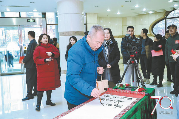 Renowned writer Liang Xiaosheng crafts greetings to celebrate the 70th anniversary of the founding of the Writers Publishing House. [Photo provided to China Daily]