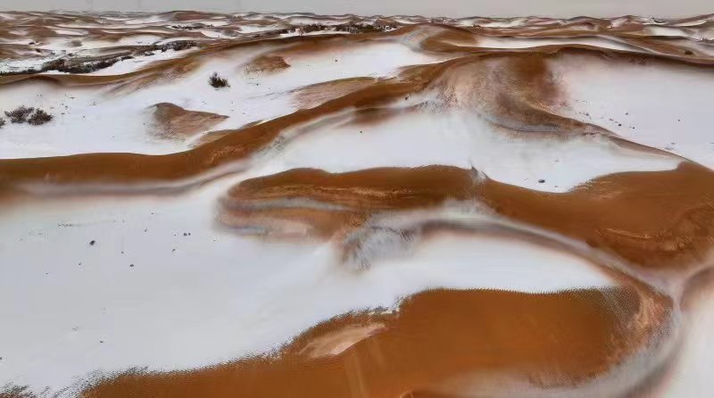 A desert in the Ningxia Hui autonomous region was covered in white after a recent heavy snowfall. It's a different kind of beauty: In Miaomiaohu village of Pingluo county of Shizuishan — on the edge of the Mu Us Desert — the golden sand sea is frosted, and the sand dunes appear taller against the snow.