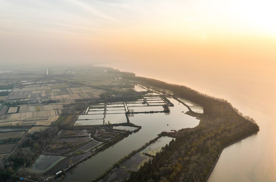This aerial photo taken on Nov 8, 2023 shows a view of Hongze Lake in Huai'an, East China's Jiangsu province. The Hongze Lake Irrigation System is a water storage irrigation area. [Photo/Xinhua]