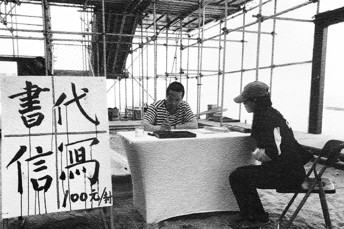A photo from an exhibit at the China Museum for Fujian-Taiwan Kinship in Quanzhou, Fujian, shows a man offering a ghostwriting service to a client in Fujian. [Photo provided to China Daily]