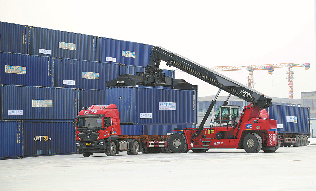 A container is loaded onto a truck at the newly opened Kazakhstan Xi'an Terminal in Xi'an, Shaanxi province, on Saturday. [Photo provided to China Daily]
