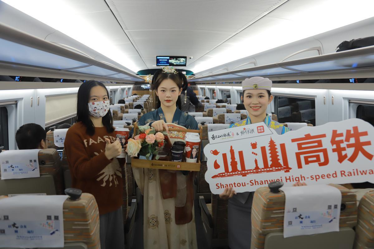 The first train departed from the station and headed for Shantou along a substantial section of a new line connecting Shantou and Shanwei in eastern Guangdong, which also began operation on Tuesday.