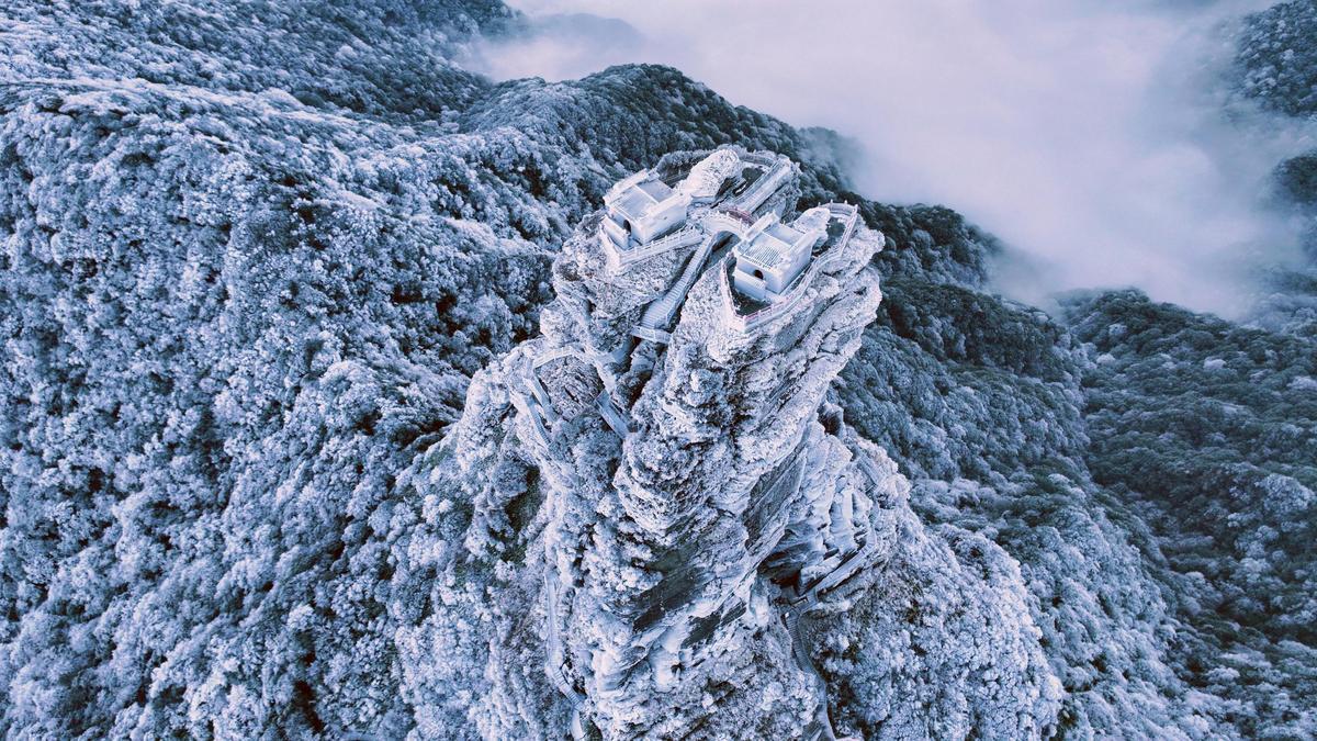 As winter arrives, snow blankets the mountain in a pristine white while the trees are adorned with delicate icicles, transforming Fanjing Mountain into a snow kingdom.