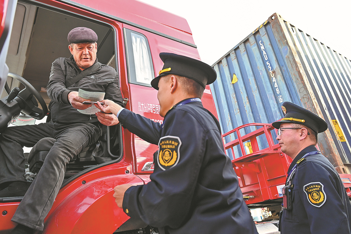 Border checkpoint officers examine the documents of an outbound truck at Irkeshtam Port in Kezilesu Kirgiz autonomous prefecture in Xinjiang Uygur autonomous region in November. DING LEI/XINHUA