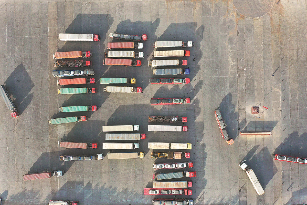 Trucks are about to exit China at the Turgart port in Xinjiang in November. DING LEI/XINHUA