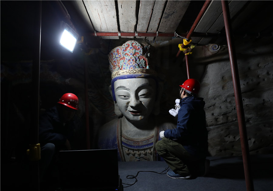 Two young restorers gather 3D data from a statue in the Yungang Grottoes in Datong, Shanxi province, April 6, 2023. High-precision mapping technology, three-dimensional laser scanning technology, computer network technology, and other scientific and technological means are used to collect information of the grottoes, building a "digital archive" for Yungang Grottoes, which makes the ancient grottoes "come alive". [Photo by Zou Hong/China Daily]