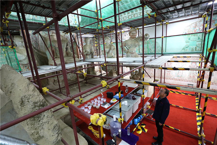 Fan Zaixuan, 62, a restorer at Dunhuang Academy, works on the site of restoration at the Mogao Caves in Dunhuang, Gansu province, May 16, 2023. Fan has been working at the Dunhuang Academy for 42 years and, though retired, he still works on the front line. [Photo by Zou Hong/China Daily]