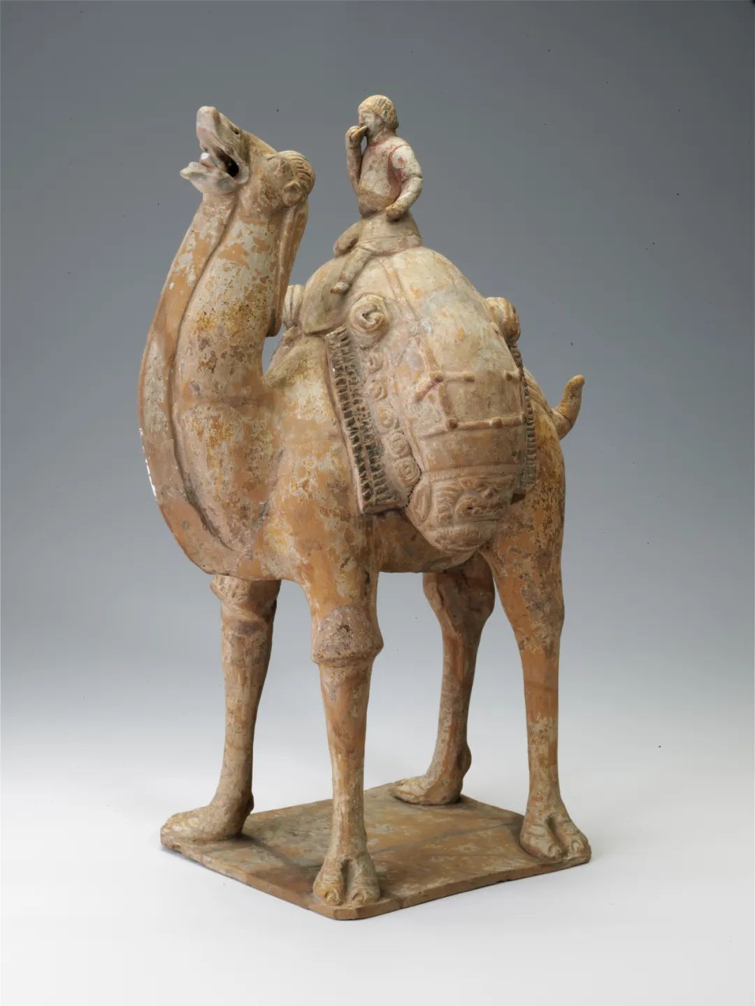 Behold this pottery figurine unearthed from the tomb of Hulyu Che (563-595), an official of the Sui Dynasty (581-618). It portrays with lifelike details a foreigner riding a camel while enjoying a meal.