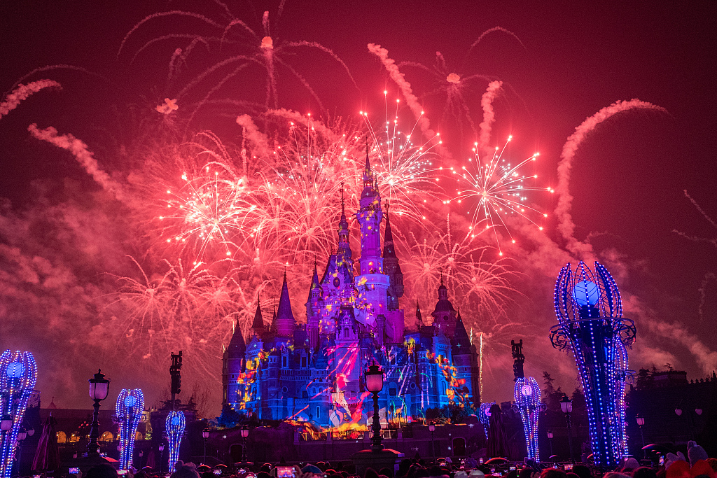 Fireworks to celebrate the New Year held at Shanghai Disney Resort, Jan 1, 2024. [Photo/VCG]