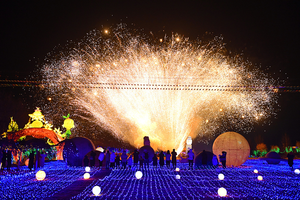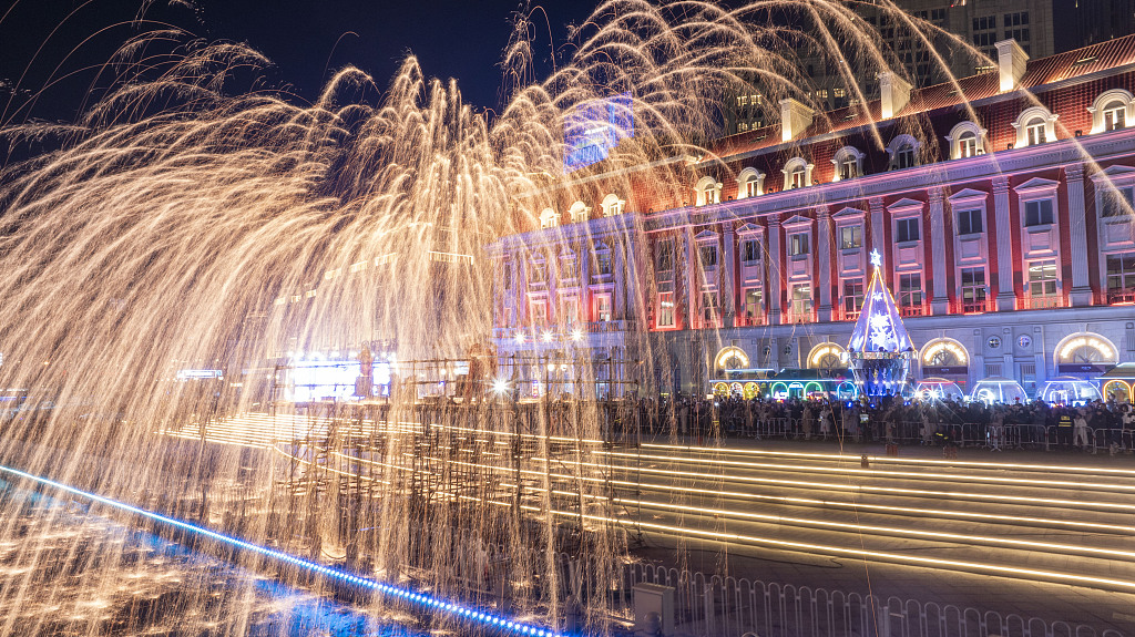 Staff members stage a molten iron fireworks performance in Tianjin, Jan 1, 2024. [Photo/VCG]