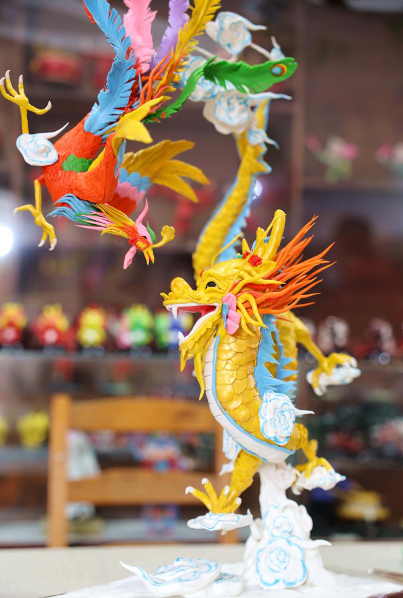 Zuo Ansheng from the Hongshizhai Intangible Cultural Heritage Museum in Yinan county, Linyi, creates a dough sculpture titled "Dragon and Phoenix Bring Auspiciousness". [Photo by Wang Yanbing/For chinadaily.com.cn]