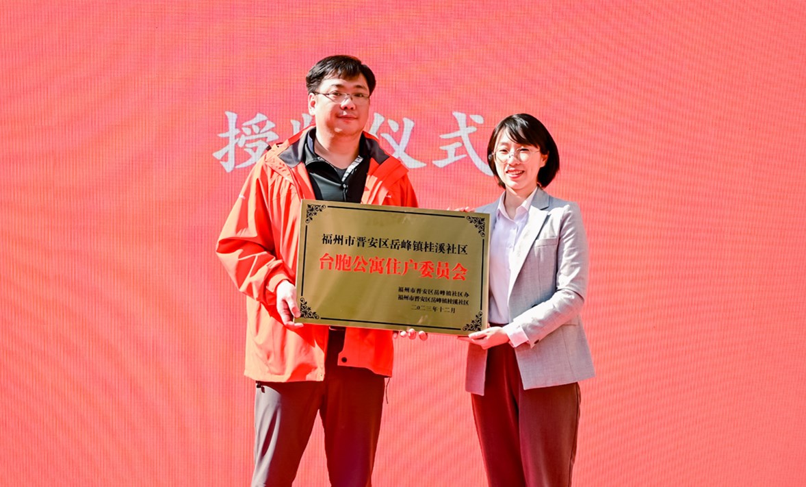 Photo taken in late December shows a ceremony being held to celebrate the establishment of the first resident committee of the Taiwan compatriots' apartment in Fuzhou, Fujian province. [Photo provided to chinadaily.com.cn]