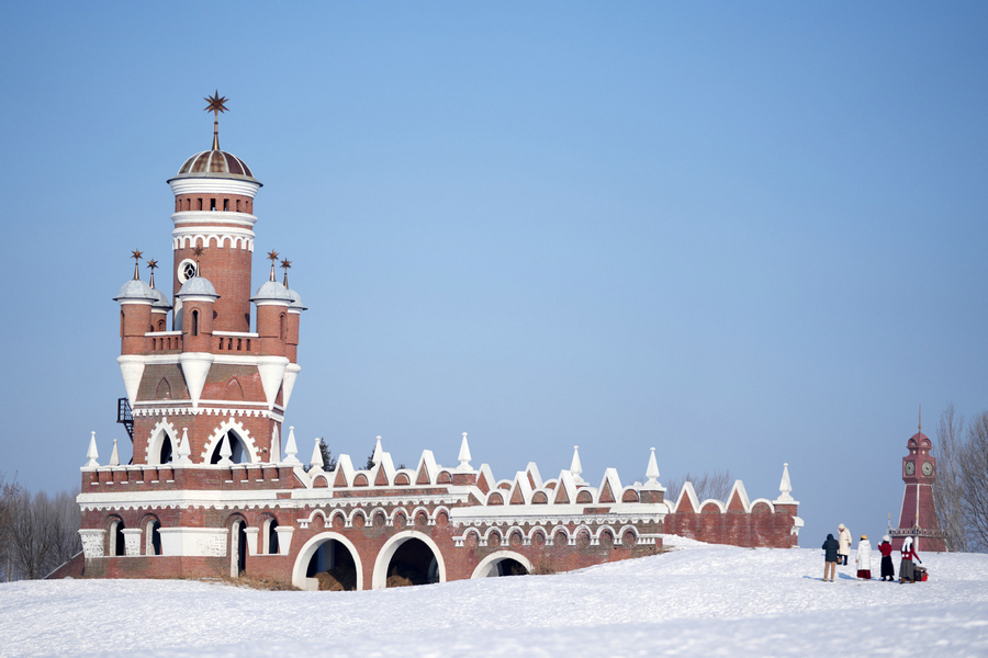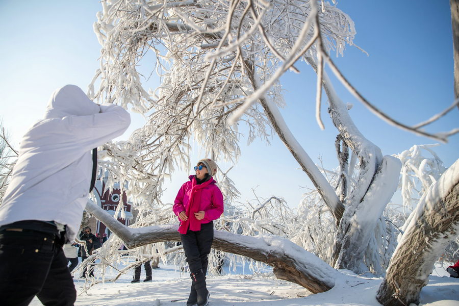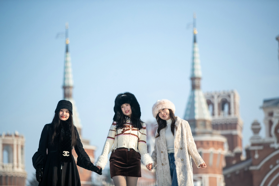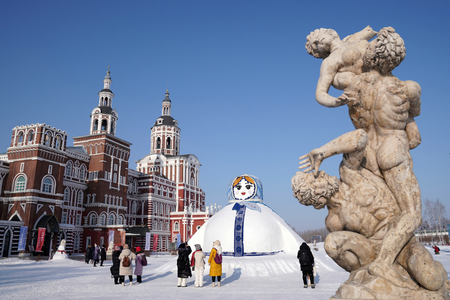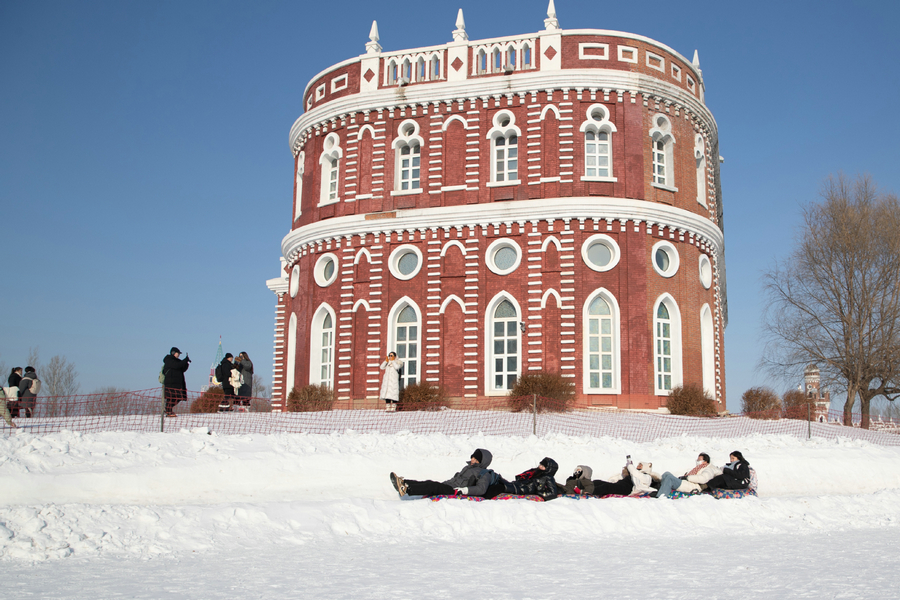 People pose for photos at the Volga Manor in Harbin, Northeast China's Heilongjiang Province, Jan 7, 2024. [Photo/Xinhua]