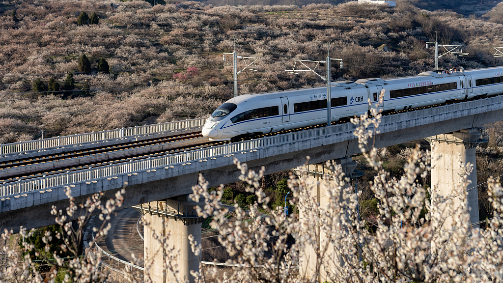A high-speed train runs at Hangzhou-Shaoxing-Taizhou high-speed railway line in Zhejiang province, Feb 21, 2023. [Photo/VCG]