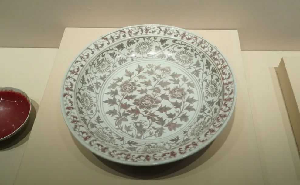 Under-glazed red plate with peony and chrysanthemum patterns, Hongwu reign (r. 1368-98) of the Ming Dynasty [Photo/Official WeChat account of the Jiangxi Provincial Museum]