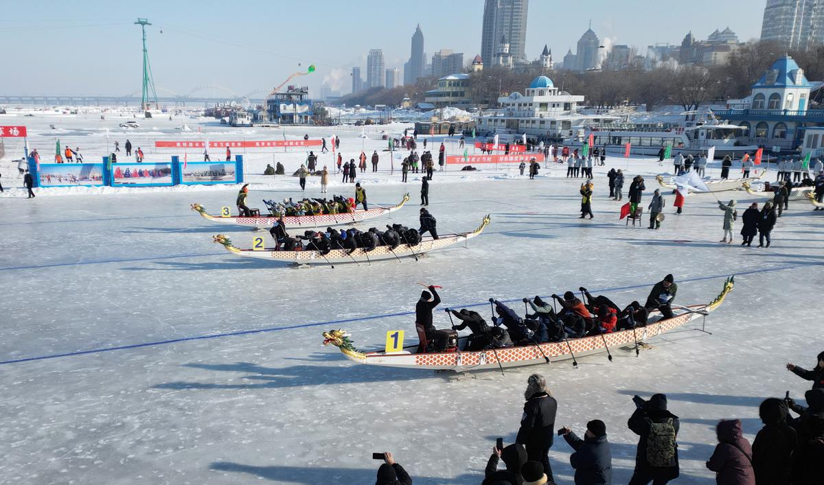 A dragon boat race on ice took place on Jan 7 on the frozen Songhua River in Harbin, Heilongjiang province. [Photo by Liu Yang/For chinadaily.com.cn]