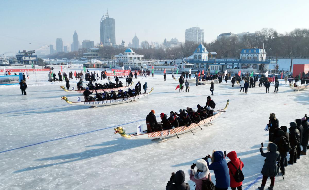 A dragon boat race on ice took place on Jan 7 on the frozen Songhua River in Harbin, Heilongjiang province. [Photo by Liu Yang/For chinadaily.com.cn]