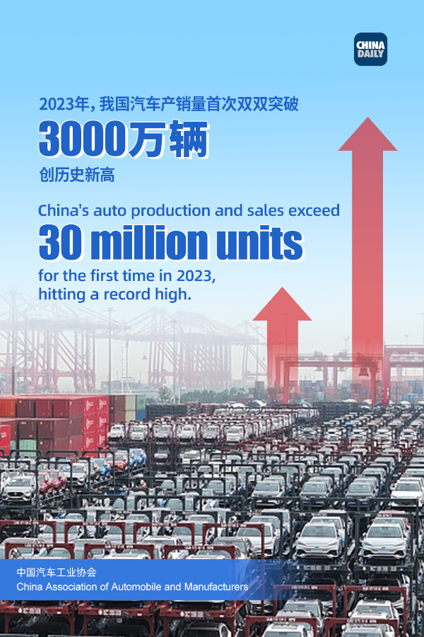China's automobile production and sales volumes both surpassed 30 million units for the first time in 2023, hitting a record high. The country exported 4.91 million units of cars, and is set to become the world's largest car exporter, China Association of Automobile Manufacturers said on Thursday.