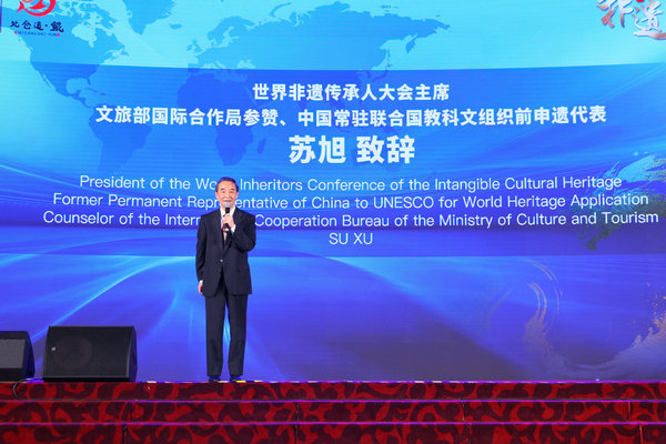 Su Xu, president of the World Inheritors Conference of the Intangible Cultural Heritage, delivers a speech at the Diplomatic Intangible Cultural Heritage Gala was held on Jan 11 in Beijing. [Photo provided to China Daily]
