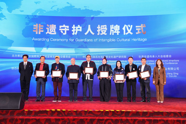 Recipients pose for a picture at the Awarding Ceremony for Guardians of Intangible Cultural Heritage. [Photo provided to China Daily]