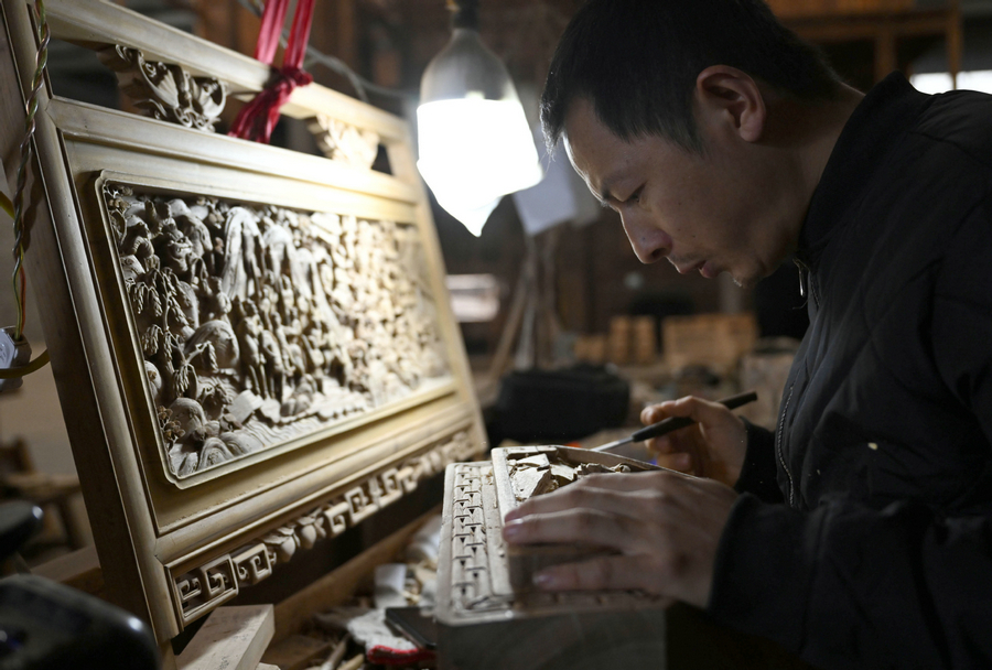 A staff member carves a decorative component for Huizhou-style antique buildings in Huangshan city, East China's Anhui province, Jan 12, 2024.[Photo/Xinhua]