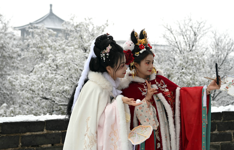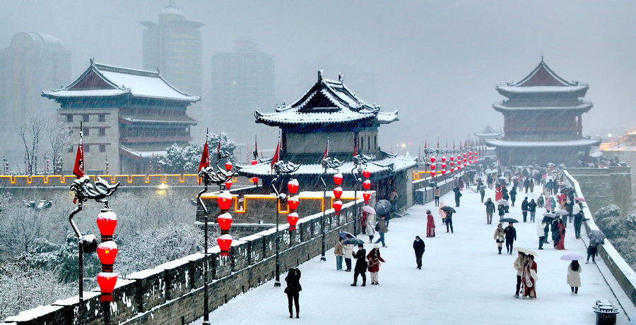 Tourists take selfies on the snow-covered ancient city wall in Xi'an, Northwest China's Shaanxi province, Jan 16, 2024. [Photo/Xinhua]