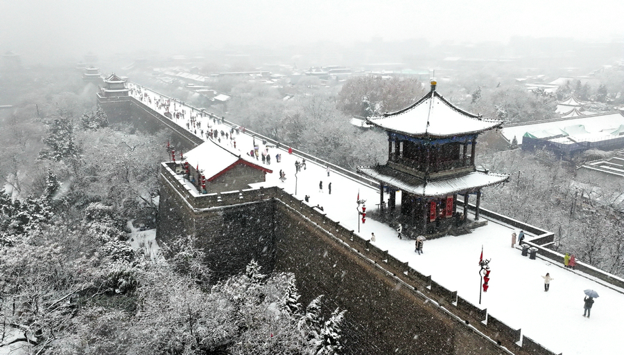 A drone photo taken on Jan 16, 2024 shows tourists visiting the snow-covered ancient city wall in Xi'an, Northwest China's Shaanxi province. [Photo/Xinhua]