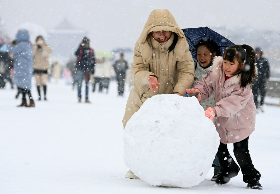 Tourists play with snow on the snow-covered ancient city wall in Xi'an, Northwest China's Shaanxi province, Jan 16, 2024. [Photo/Xinhua]