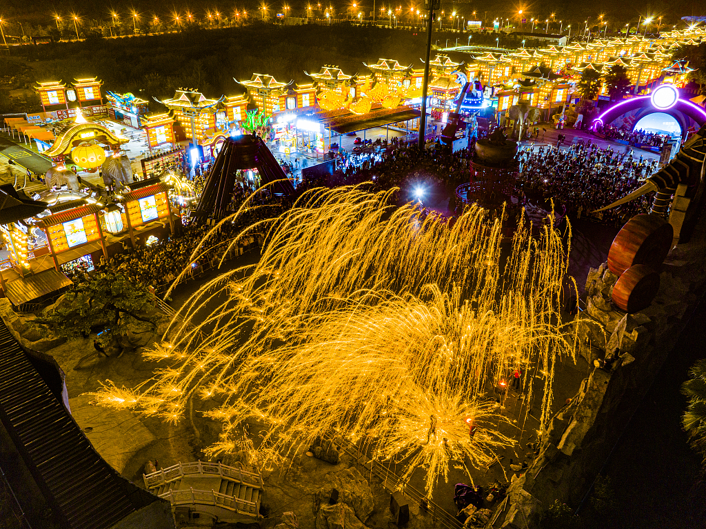 , or strike iron flower, an intangible cultural heritage, is performed at the night market named "The Night of Nanning" in Nanning, Guangxi Zhuang autonomous region on Jan 17, 2024. [Photo/VCG]