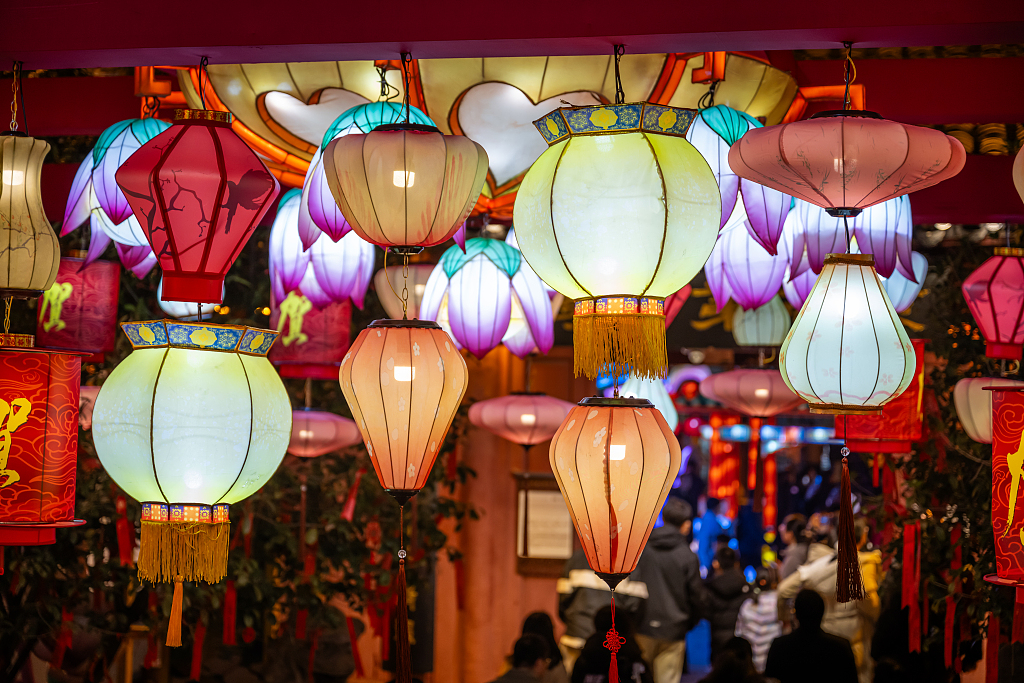 Lanterns are lit and hung along the pedestrian street of the Fuzi (Confucius) Temple scenic area during the annual Qinhuai Lantern Festival in Nanjing, Jiangsu province, Jan 13, 2024. [Photo/VCG]