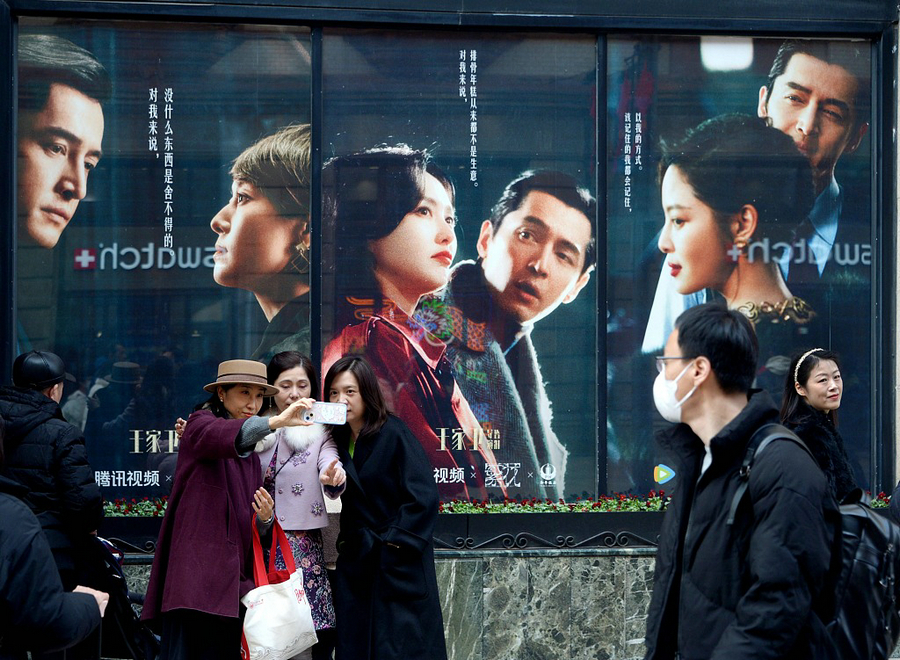 Visitors pose for photos in front of posters for the Chinese TV series "Blossoms Shanghai" at the Peace Hotel in Shanghai on January 13, 2024. The hit series has attracted many fans to visit the city's film locations.[Photo/CGTN]
