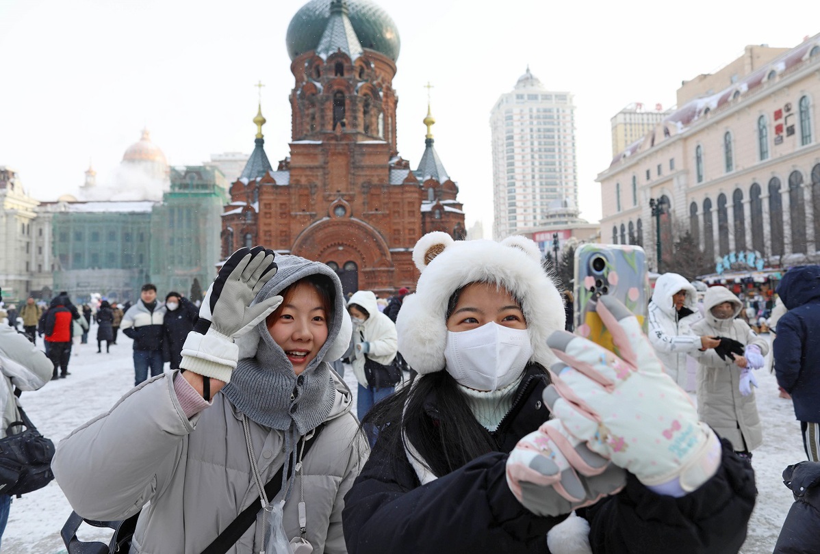 Visitors pose for photos in front of the St. Sophia Cathedral, a landmark of Harbin, Heilongjiang province, on Jan 21, 2024. [Photo by Zhu Xingxin/For chinadaily.com.cn]