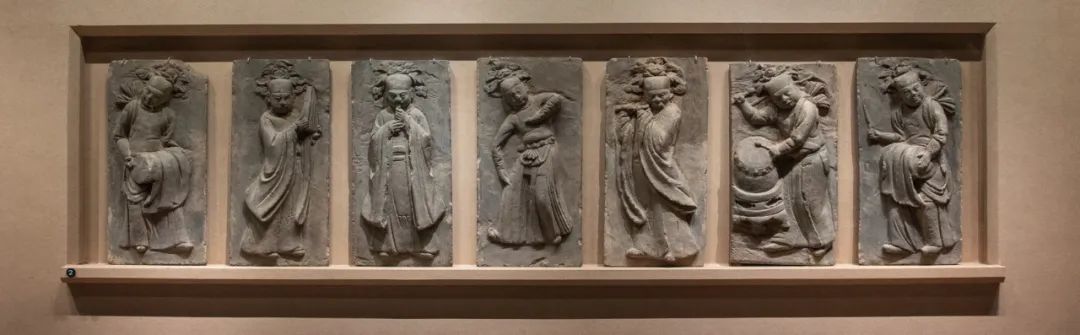 This set of brick reliefs depicts a band of seven male figures, all in standing position and performing dance and music. At the center is a dancer, flanked by six musicians playing various instruments: a waist drum, clapper (paiban), bili (a reed flute), and bamboo flute and drum, creating a harmonious ensemble.