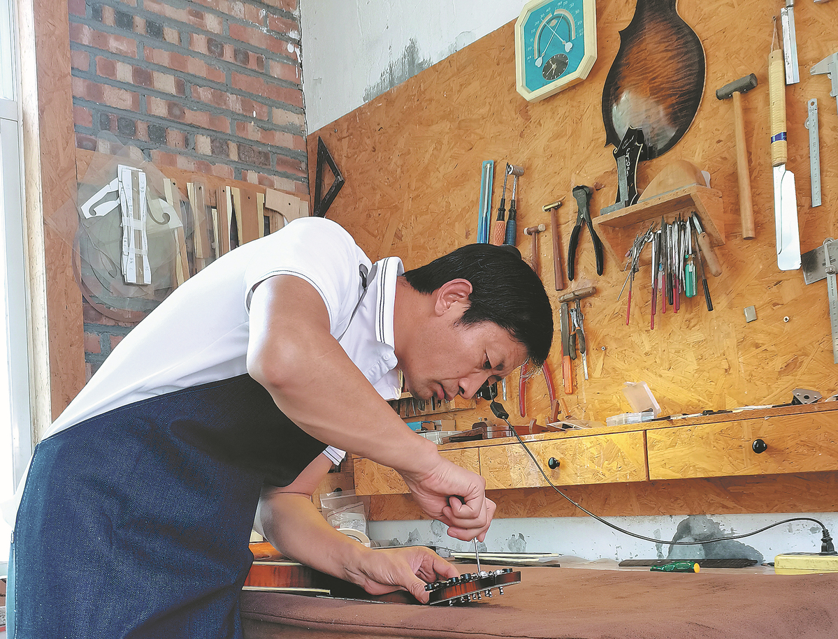 Attracted by the growing musical instrument industry in his hometown, Qin Jiduo, a former senior employee at a renowned mandolin manufacturer in Qingdao, Shandong province, returned to Tangwu in 2016.