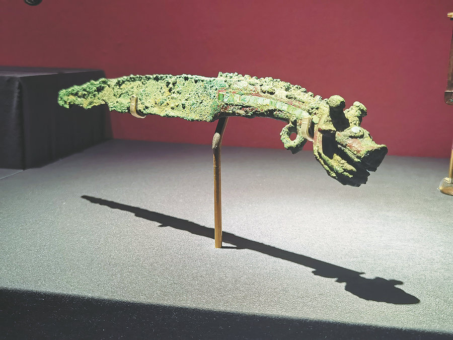 Though smaller in size and rougher in appearance, one of the bronze daggers on display may prove equally amazing. Carved in the shape of dragon head with a pair of turquoise eyes, the Shang Dynasty (c. 16th century-11th century BC) dagger, which displays typical elements from both China and West Asia, hints at the kind of cultural exchanges that occurred across the Eurasian grasslands before recorded history.