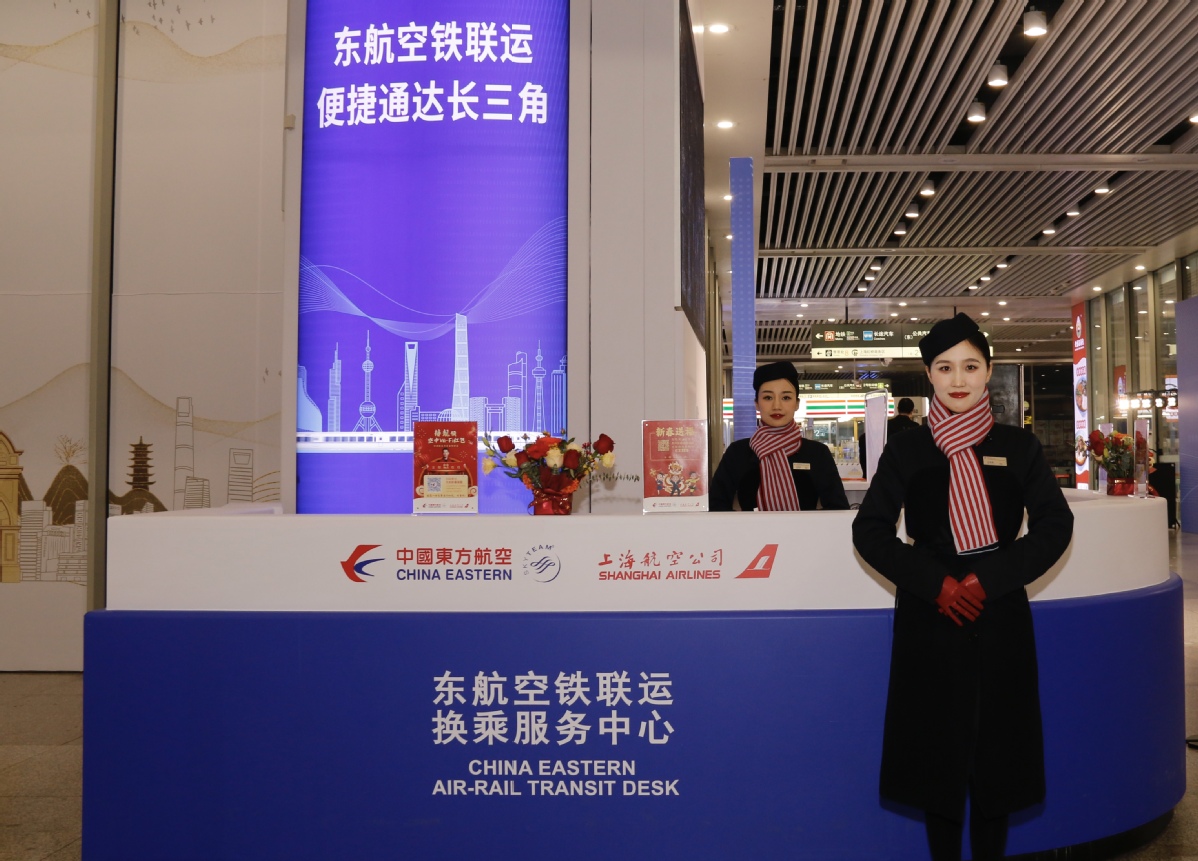 A rail-air transit service center is launched on January 2 at the Shanghai Honggiao Railway Station, allowing air travelers transiting via Shanghai's two airports to check in in advance at the railway station. [Photo provided to China Daily]