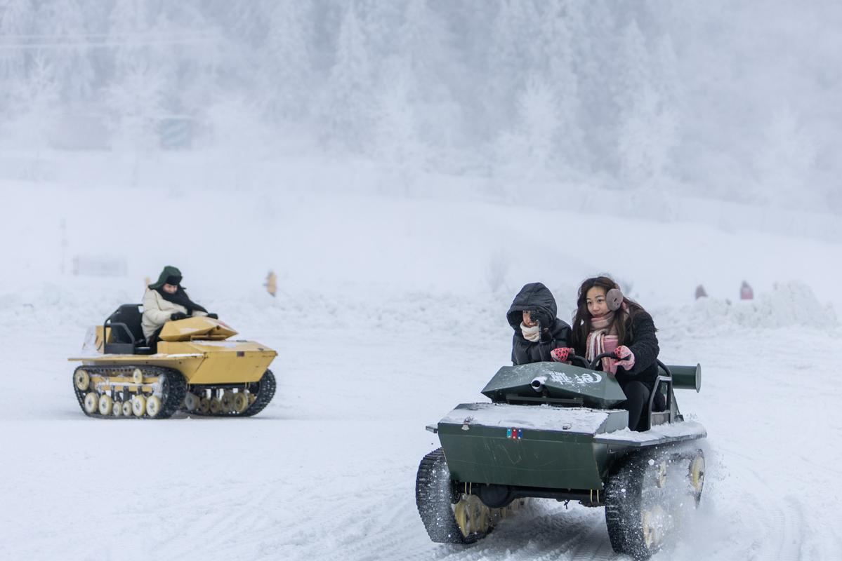 Tourists drive tank-shaped ski vehicles at a resort area in Fengdu county of Chongqing on Jan 25, 2024. [Photo/Xinhua]