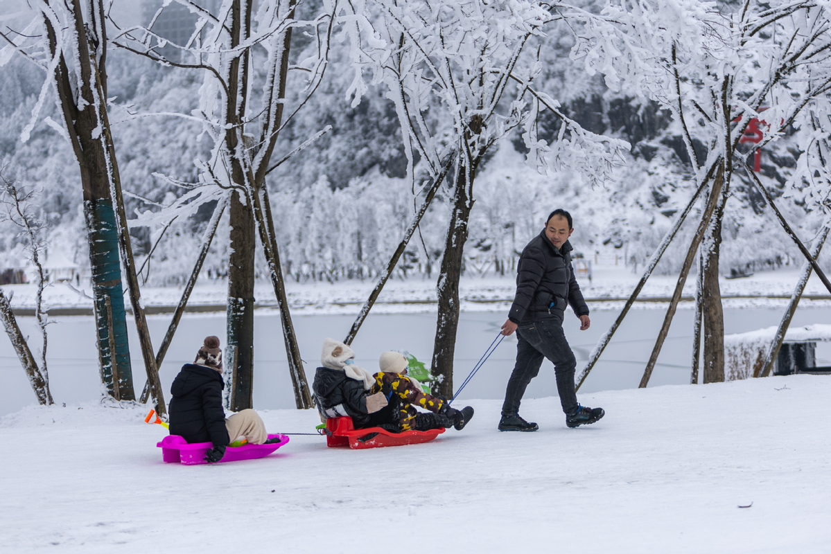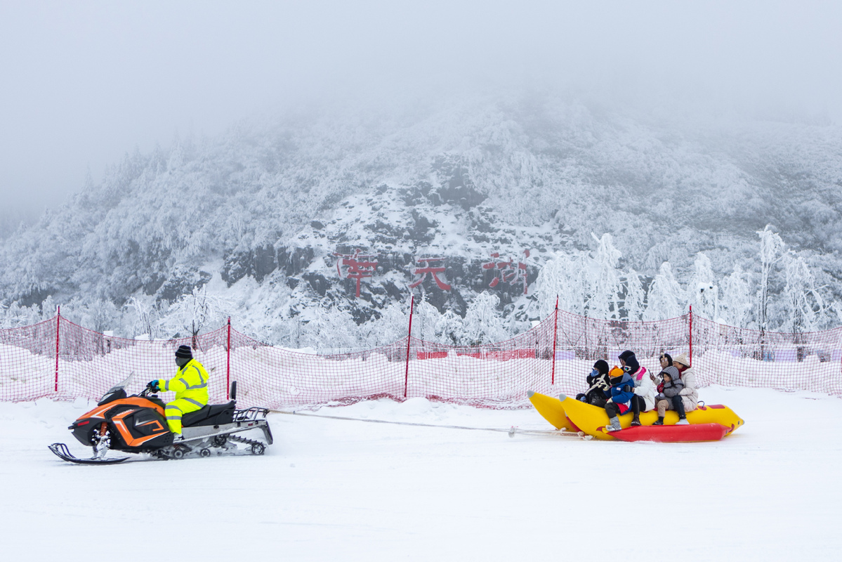 Tourists sit on a sleigh dragged by a ski vehicle at a resort area in Fengdu county of Chongqing on Jan 25, 2024. [Photo/Xinhua]
