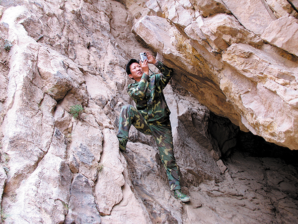 Fan takes a photo of a rock painting on a cliff in 2007. [Photo provided to China Daily]