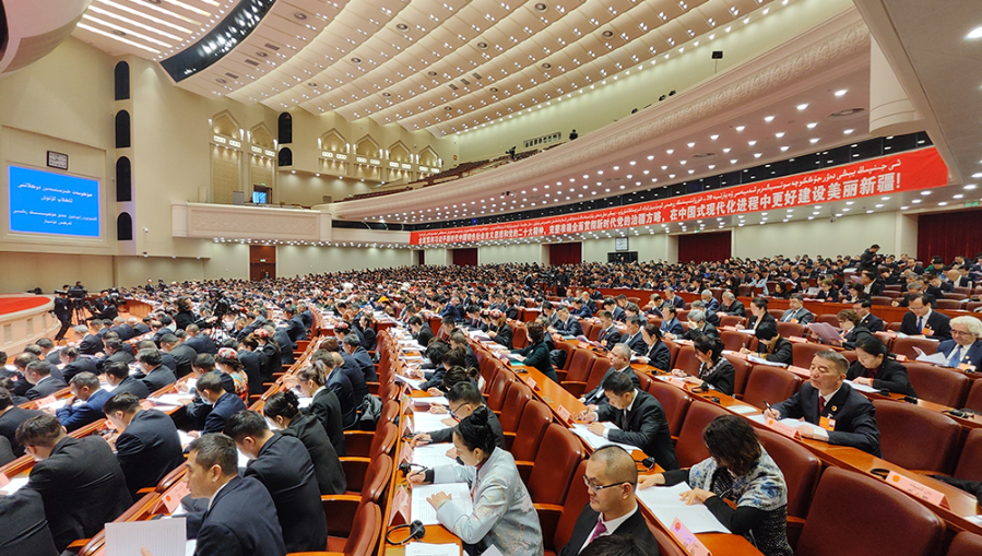 The second session of the 14th People's Congress of Xinjiang Uygur Autonomous Region began on Jan 30, 2024, at the Xinjiang People's Hall in Urumqi, Northwest China's Xinjiang Uygur autonomous region. Erkin Tuniyaz, chairman of the People's Government of Xinjiang Uygur Autonomous Region, delivered the report on the work of the government.