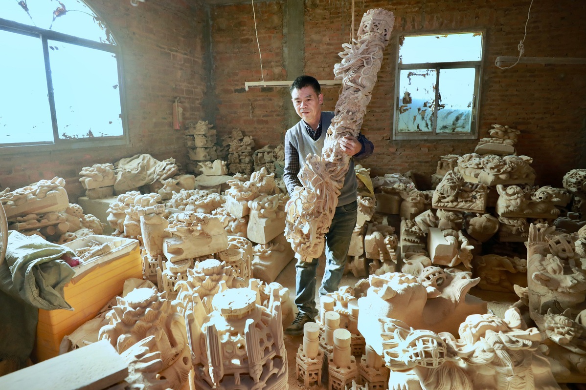 Workers transport dragon pillars inside the Jinjiang Yida Ancient Architecture Engineering Co Ltd workshop in Panshan village, Jinjiang, Fujian province, Jan 27, 2024.[Photo by Jiang Kehong/For chinadaily.com.cn]