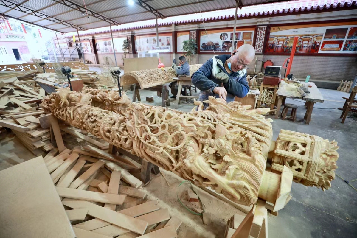 Workers carve dragon pillars inside the Jinjiang Yida Ancient Architecture Engineering Co Ltd workshop in Panshan village, Jinjiang, Fujian province, Jan 27, 2024. [Photo by Jiang Kehong/For chinadaily.com.cn]