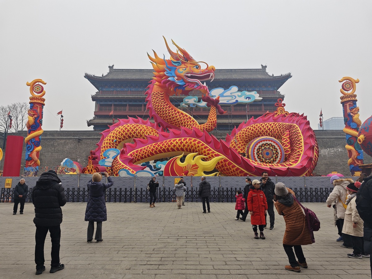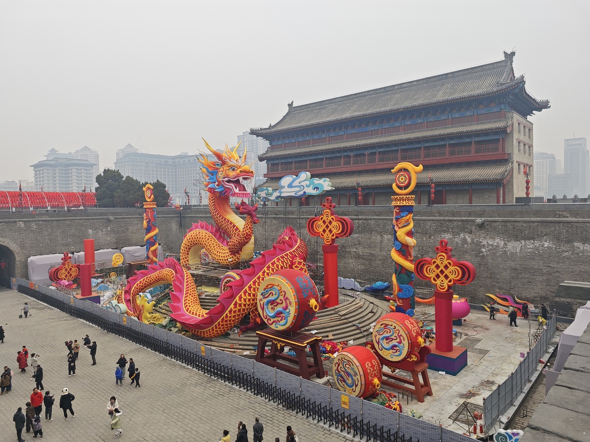 In Yongningmen, the south gate of the Xi'an City Wall scenic area, a massive dragon display is nearly completed. It is 18 meters high and is based on the prototype of the Hongshan Jade Dragon, a C-shaped jade dragon unearthed from Chifeng, Inner Mongolia autonomous region, in 1971. The dragon is accompanied by Chinese knots, drums and auspicious clouds, giving it a harmonious and inspirational appearance.