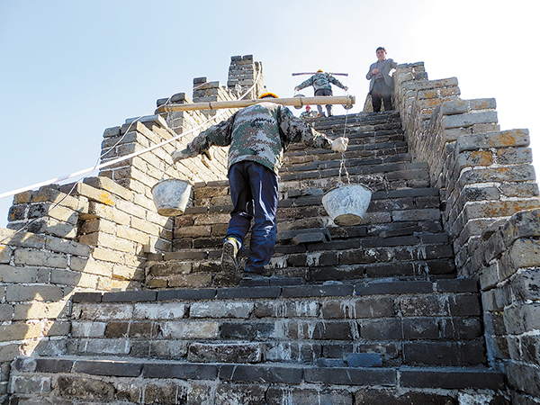 "You need to look around whenever you lay a tile, taking into account such factors as gradient changes … The mules can carry the repair materials to the foot of the Great Wall, but we still need to carry them up to the (construction) sites ourselves."