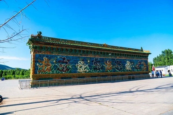 The Jiulong Wall, a type of screen wall in traditional Chinese architecture, dazzles with a radiant glow at sunrise, casting a resplendent light on its nine dragons, creating a lifelike and breathtaking spectacle.