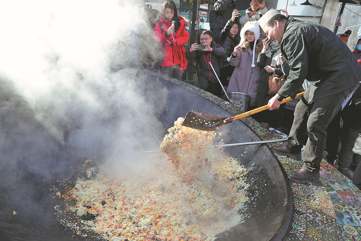 A chef cooks pilaf for visitors at the Silk Road Mountain Resort on Dec 19. WANG JING/CHINA DAILY