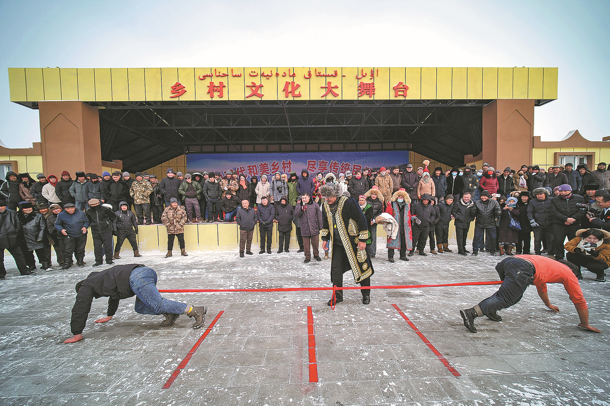 Villagers compete in a tug-of-war during a folk festival held in Mulei county, Xinjiang, on Dec 21. ZHANG CHENG/XINHUA