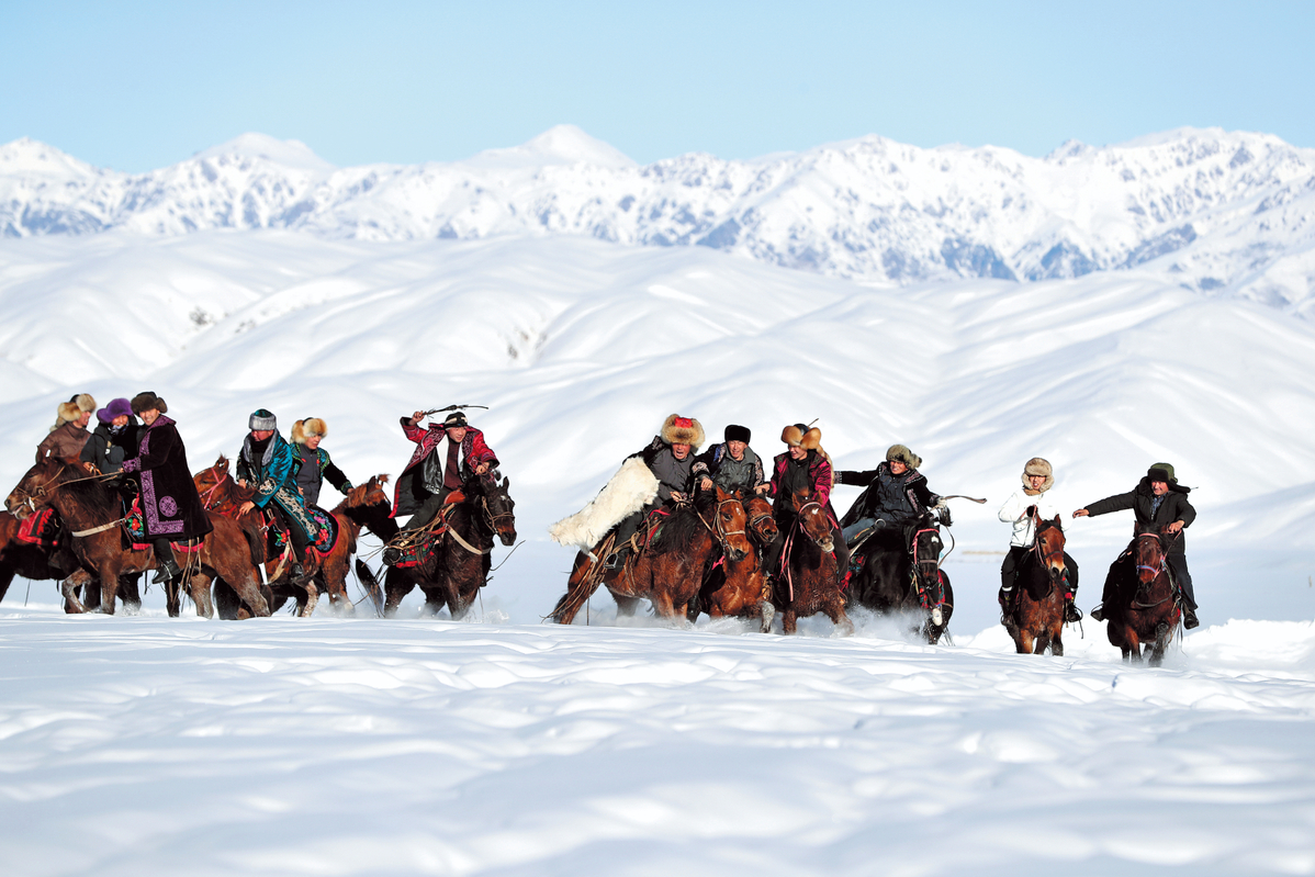 Kazak herders participate in the traditional game of "scrambling for a sheep" at a scenic area in Xinyuan county, Ili Kazak autonomous prefecture, Xinjiang, on Dec 22. WANG JING/CHINA DAILY