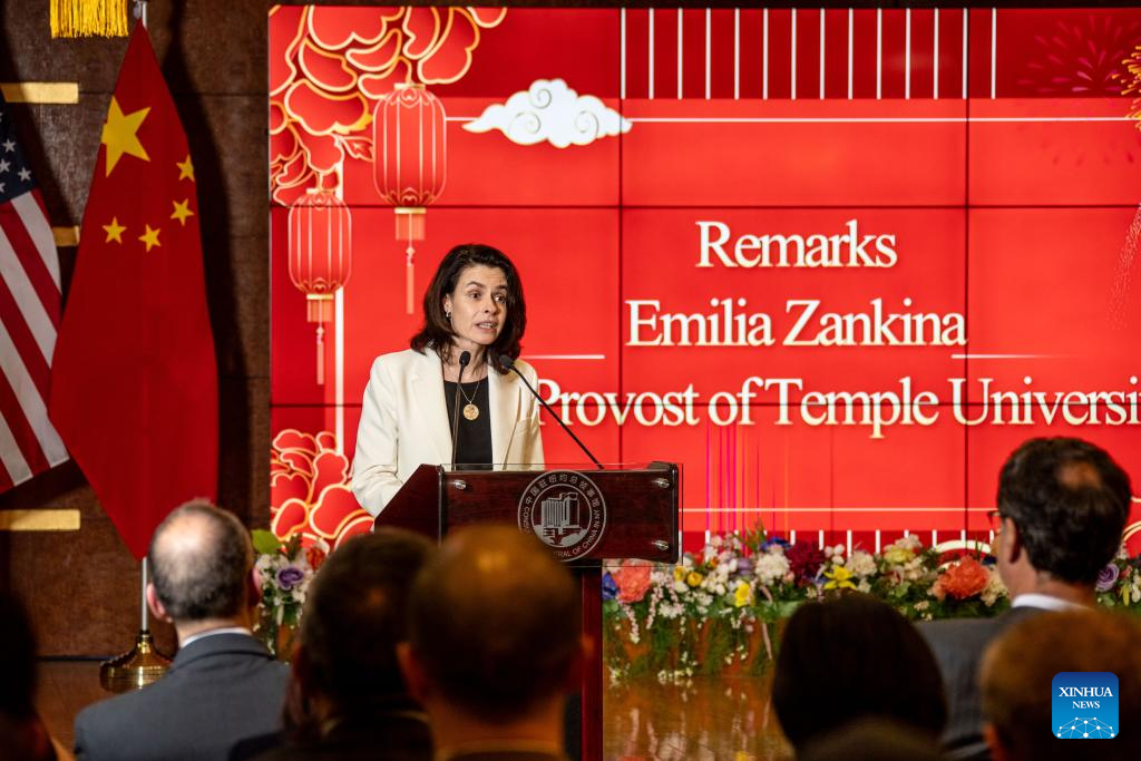 Emilia Zankina, Temple's vice provost for global engagement, speaks during an event in commemoration of the 45th anniversary of Temple University's conferment of an honorary Doctorate of Law to then Chinese Vice-Premier Deng Xiaoping, at the Chinese Consulate General in New York, the United States, on Jan 31, 2024. [Photo/Xinhua]