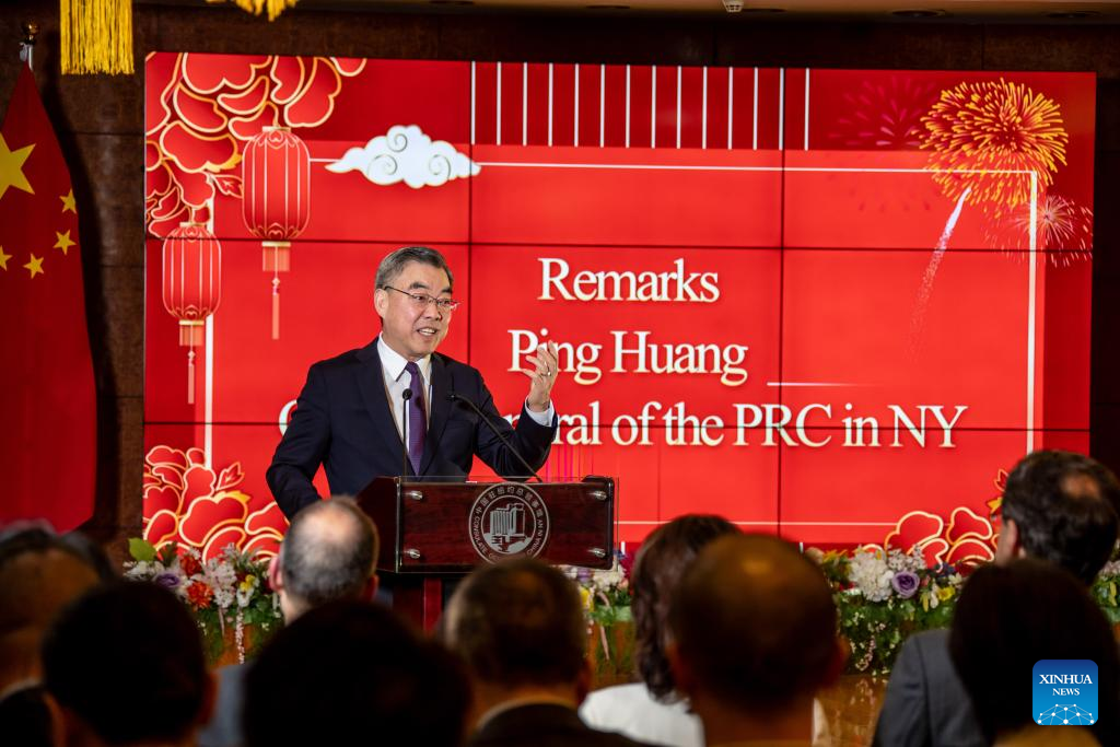 Huang Ping, Chinese Consul General in New York, speaks during an event in commemoration of the 45th anniversary of Temple University's conferment of an honorary Doctorate of Law to then Chinese Vice-Premier Deng Xiaoping, at the Chinese Consulate General in New York, the United States, on Jan 31, 2024. [Photo/Xinhua]